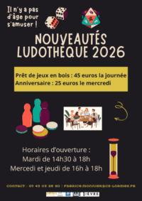 Ouverture Mardi 14h30-18h Mercredi 16h-18h Jeudi 16h-18h Viens fêter ton anniversaire le mercredi à la ludothèque, 2 allée Adrien Silvain à Lormes Contact fabrice.monnier@cs-lormes.fr