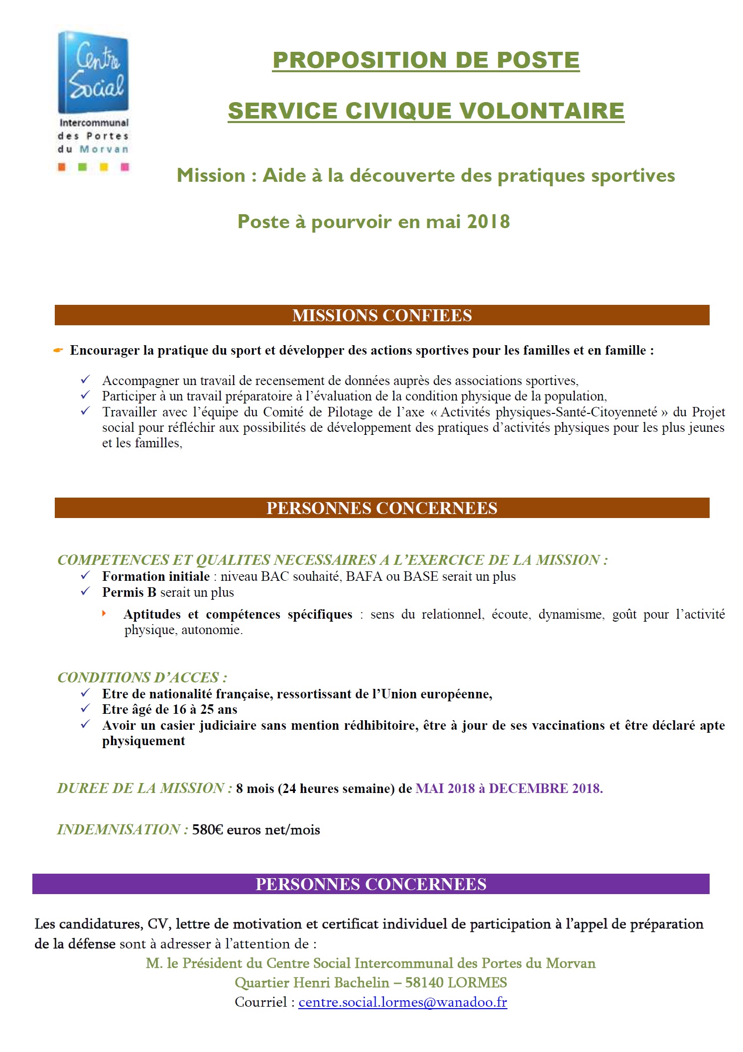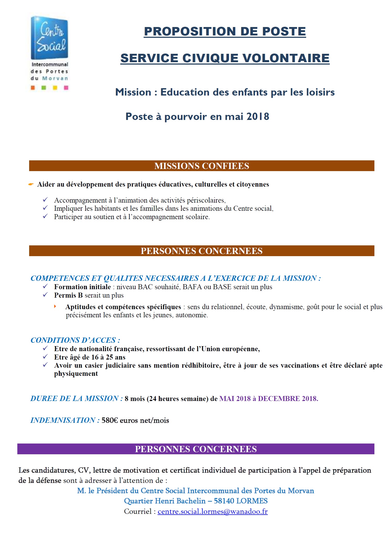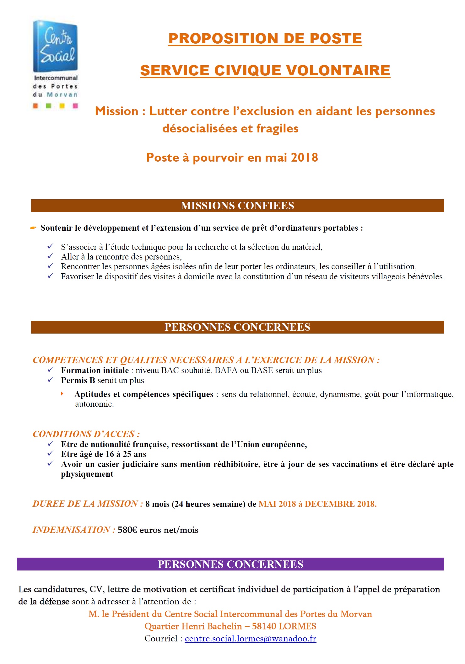 Offres d’emploi 2018 du Centre Social de Lormes :