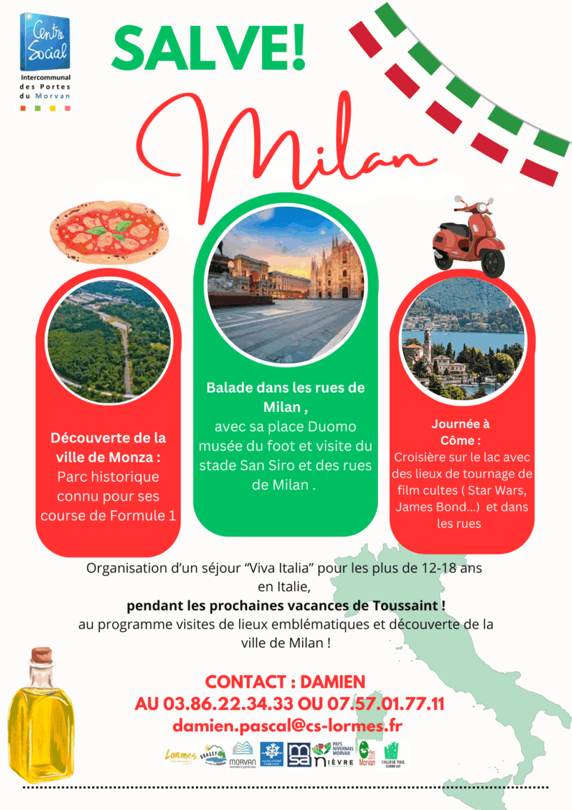 Damien et Alexis emmèneront un groupe d’ados à Milan du lundi 20 au samedi 25 octobre. Attention les places sont limitées à 7 jeunes seulement. Ne tardez pas à vous inscrire auprès de damien.pascal@cs-lormes.fr