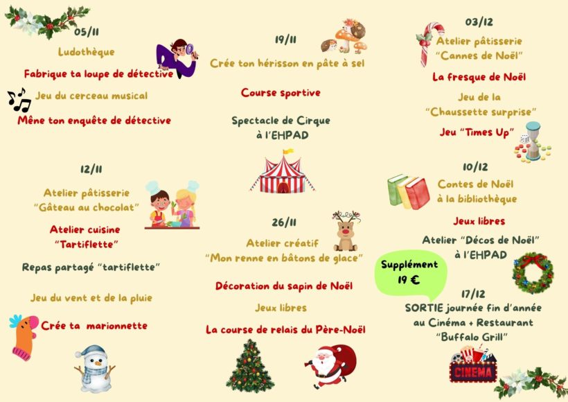 Voici le programme des mercredis de la Cité des Enfants jusqu’à la fin de l’année: des jeux, du cirque, de la cuisine, des décorations et des contes de Noël et une sortie cinéma et restaurant pour clôturer l’année!